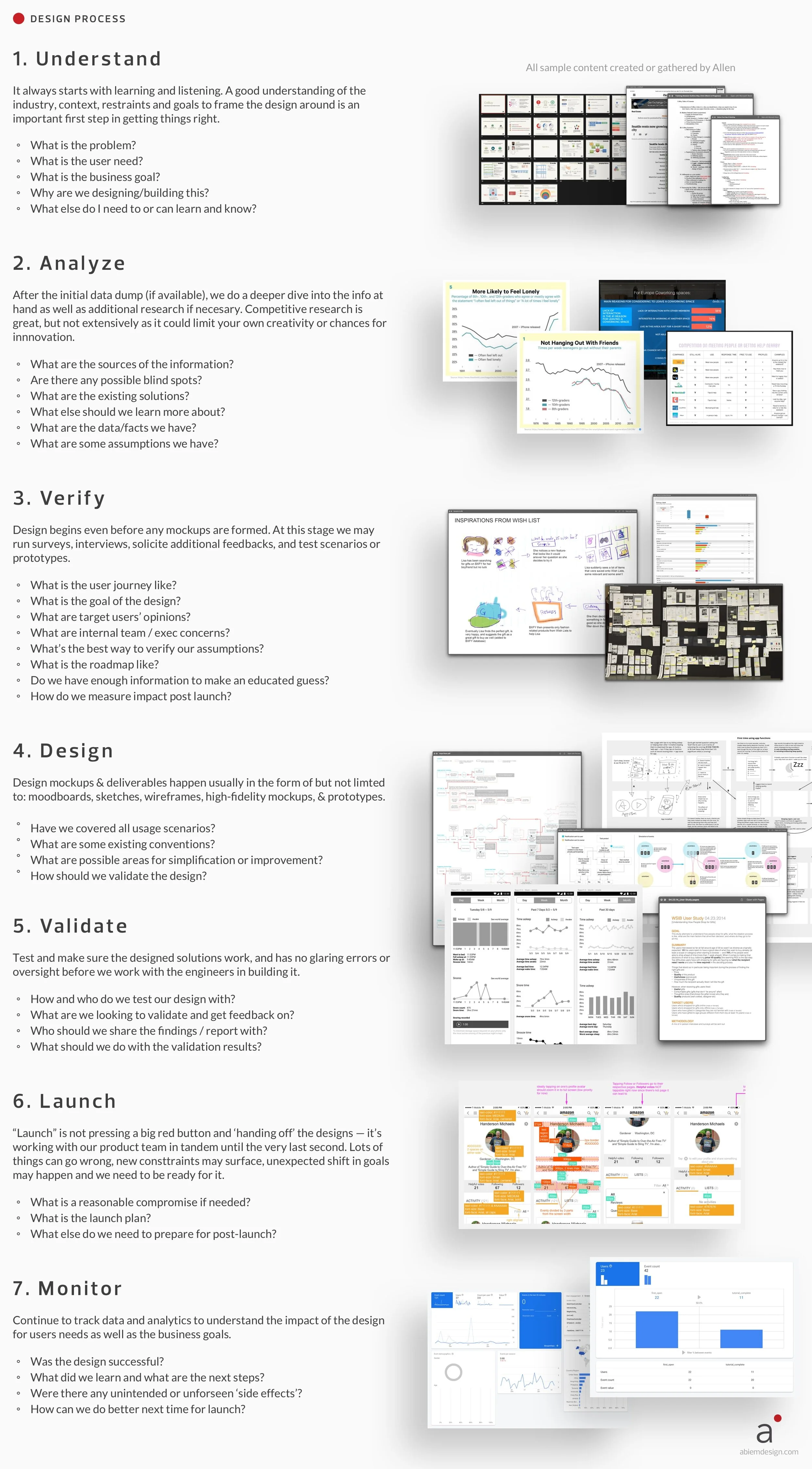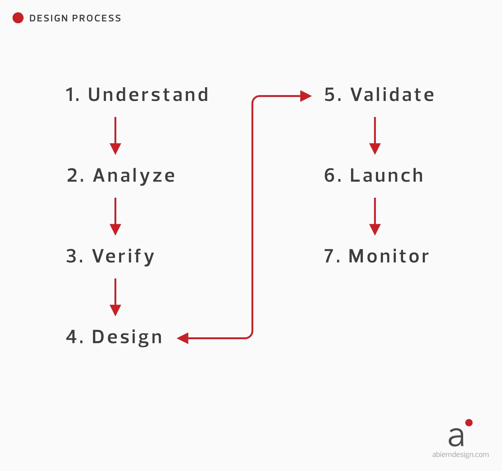In a perfect scenario, any design would go through a process where there’s ample time at every stage, enough data points and input to support decisions, enough resources to enables the ideal outcome, and time to revisit and improve everything. Of course real-world scenarios are often the complete opposite and (especially in a consultancy environment) often forces us to internalize some of the steps. At a high level it this is how I approach my design strategy.